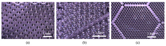 Based on Equation (10), the surface fill factor with the circular aperture is hard to reach higher than 80% as the voids among the circular apertures are inevitable. To achieve the higher surface fill factor, the different aperture is often suggested, for example, square and hexagonal apertures can be easily filled up the surface. Figure 7 demonstrated the MLAs with different apertures. Figure 7a shows an MLA with a low fill factor of 30.7% with sparsely designed circular aperture whereas Figure 7b,c show MLAs with square and hexagonal the achieving fill factor up to 82.6% by changing the aperture geometry and layout of the MLAs. With this fabrication process, fill factor can be easily modified by changing the mask pattern layout and aperture geometry, this allows vast freedom while designing the MLAs to fit various purposes and accommodate different devices. Low fill factor MLAs are suitable for separating the MLAs into individual microlenses, which can be used on micro-optical fibers or probes. High fill factor MLAs can be used on CCD arrays or digital screen for converging light onto the photoactive region.