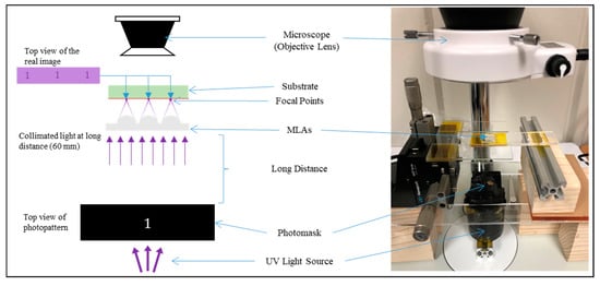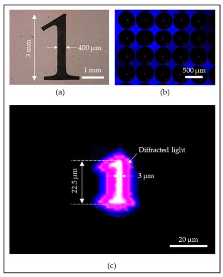 To demonstrate the functionality of the microlens array, a projection lithography scheme has been implemented where the main optical microlenses were fabricated by the TDTR process as described in Figure 8. The projection lithography is a type of photoreduction system in which a relatively large photopattern is projected into a smaller size pattern in microscale using a microlens. This technology is useful when an array of microscale patterns is needed. While the conventional system of the projection lithography used to have a single lens, the uniqueness of the system utilizes an array of the microlens, which produce the photo-reduced image in the form of an array. In this experiment, a photomask with pattern shape ‘1’ was placed above the UV light source to ensure the maximum amount of beam energy was passing through the mask pattern. A fabricated MLA with a diameter of 500 µm and a focal length of 450 µm was prepared using the TDTR process. The MLA was placed at a relatively long distance of 60 mm to the focal length, which was 133 times the focal length, so the incident light rays to the MLA can be considered close to the collimated state, which is desirable for the projection lithography process. An optical microscope was set above the MLA to monitor the photo-reduced images from the MLAs. The result from the projection lithography is presented in Figure 9. The photomask with pattern ‘1’ as shown in Figure 9a had a vertical line width of 400 µm and a length of 3 mm. Figure 9b shows the photo-reduced image through the microscope where an array of lenses and the projected images at the center of each microlens are shown. Figure 9c shows a close-up view from the one of the photo-reduced image formed by the microlens. The dimension of the brightest area of the projected image had a line width of 3 µm and a length of 22.5 µm, which matches with the theoretical reduction ratio of 133.
