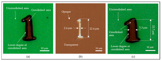 The photo-reduced image was converted to a chromium glass to serve as a photomask with micropatterns to demonstrate the capability of the photomask fabrication. The chromium glass was spin-coated with positive photoresist, S1805, and loaded into the photoreduction system. The sample was UV-exposed for 15 s using 405 nm UVLED and followed by the development in the photoresist developer (Tetramethylammonium Hydroxide solution, MF 319, Rohm & Haas Electronics Materials LLC, Marlborough, MA, USA) for 1 min. The sample was rinsed with DI water and carefully dried with air to complete the process. Figure 10a shows the result of the photoreduction with pattern ‘1’ and Figure 10b shows the same photo-reduced pattern with the chromium etched out, which can be used as a photomask. The linewidth of the main body of the photo-reduced pattern ‘1’ was measured to be 2.6 µm, which had a 400 nm difference from the theoretically calculated linewidth as well as the measured linewidth as shown in Figure 9c. This gap can be explained by the resolution limitation of the wavelength of the UVLED (405 nm) that was used in the scheme. As the wavelength of the light source is limited to 405 nm, it is inevitable to have a 400 nm difference in the process. Regardless, this issue can be resolved by replacing the current 405 nm UVLED light source to another UV light source with a shorter wavelength. Another method is by reducing the intensity of the current light source and increase the exposure time, the drawback of this method is the increase of process time.