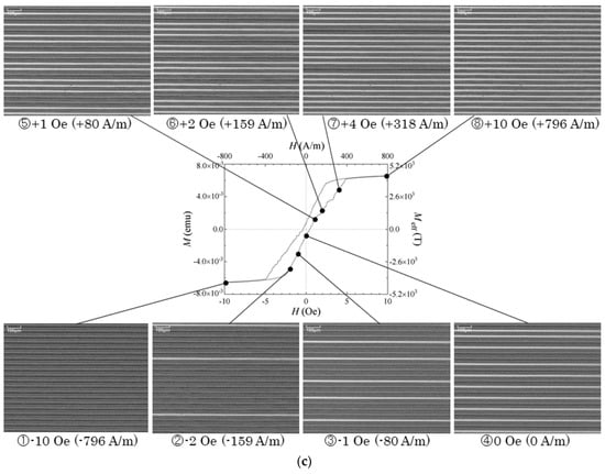 - θ = 61°: The initial single domain in the − direction of whole elements as shown in the photo view change to the ILLD gradually and individually with the increase in the applied field. After the domain of all elements changes to the ILLD, then the width of the area of the striped domain gradually changes and, finally, the stripe of the ILLD is erased and all elements change to the single domain in the + direction. When the elements are all in the state of a single domain, +, the many-body element is getting magnetically saturated.