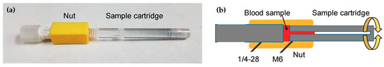 Figure 1. (a) Photograph of an assembled nut-and-bolt sample cartridge with a reaction chamber. (b) Cross section of a nut-and-bolt microfluidic reaction chamber formed by a nut (yellow) and a bolt-like sample cartridge (grey). The reaction chamber is filled with a blood sample (red).
