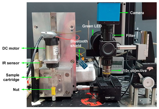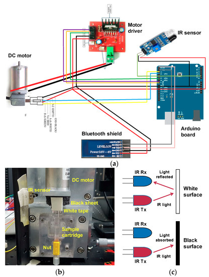 The sample cartridge was fixed to a DC motor, along with an encoder to improve the control of the rotation speed. A DC encoder motor (MB4060E-0512-24V, RobotMart, Seoul, Korea) was attached to an Arduino UNO (R3, NTREX, Incheon, Korea) board with a Bluetooth shield (HC-06, LK EMBEDDED, Seoul, Korea), so that the rotation speed and duration could be controlled using a smartphone, as shown in Figure 2a. An Arduino code was written to control the motor. We also used an infrared (IR) sensor to keep the bidirectional rotation consistent. The IR sensor has two main parts: a transmitter and a receiver. The top part of the motor was wrapped in a black sheet, and white tape was placed in a small portion of that material as shown in Figure 2b.
