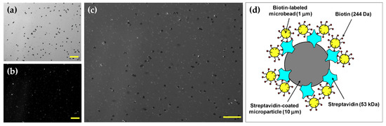 After rotating the motor at 1500 rpm for a few minutes, the avidin–biotin mixture was placed onto a glass slide and images were captured using a charge-coupled device (CCD) camera (DMK21BU618, ImagingSource, Bremen, Germany) under both fluorescence and bright-field modes. The avidin molecules were conjugated with non-fluorescent polystyrene microparticles having a 10-µm diameter as shown in Figure 3a, whereas the biotin molecules were conjugated with 1-µm fluorescent microbeads as presented in Figure 3b. The fluorescent microbeads were excited at a wavelength of 505 nm and fluoresced at 515 nm. Figure 3c shows the image of microbead complexes made by the avidin–biotin interaction, which is described schematically in Figure 3d.