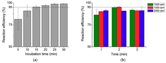 Figure 5. (a) Reaction efficiency measured at the diffusion-based reaction process for different incubation times from 5 to 30 min with an interval of 5 min. (b) Reaction efficiency achieved by bidirectional rotation mixing at different motor rotation speeds (1000, 1500, and 2000 rpm) and durations (1, 2, and 3 min).