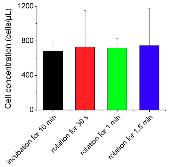 The CD4 cell images obtained were 0.6708 mm in width and 0.8867 mm in height, and the channel depth was 0.1 mm. Therefore, one image contained 0.0595 µL of the blood sample volume. We took 10 images at different parts of the imaging chamber and counted the absolute number of CD4 cells in the fixed volume to measure the CD4 cell concentration. We incubated the blood sample with CD4 antibodies for 10 min and then applied our sample mixing system at 1000 rpm for comparison of the reaction rate. Different binding characteristics between avidin-biotin and antigen-antibody reactions require different parameter sets for efficient mixing. As we obtained lower numbers of CD4 cells at 1500 rpm in our preliminary study, we performed the labeling of CD4 cell with antibody at 1000 rpm. The duration for sample mixing was set at 30–90 s to avoid the blood clotting at longer durations. As shown in Figure 6, the CD4 cell concentration was slightly higher in the mixing method than in the incubation method even with a much shorter reaction time by a factor of 20. Importantly, our results imply that the labeling of immune cells with specific antibodies can be accomplished in less than a minute using the proposed mixing module without increasing the amount of costly antibodies.