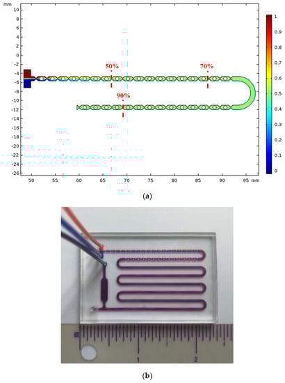 The micromixer is the key to the microfluidic chip, which has a great impact on the detection time and sensitivity of this biosensor. COMSOL software (COMSOL Inc., Stockholm, Sweden) was used to simulate the mixer with a convergence-divergence structure and evaluate its mixing efficiency. As shown in Figure 1a, the mixing efficiency reaches 50%, 70% and 90%, when the number of the convergence-divergence structures is 7, 16 and 28, respectively. This indicates that the convergence-divergence mixer has an excellent mixing efficiency. To ensure complete mixing of MNPs modified with monoclonal antibody against Salmonella Typhimurium, the MnO2-QD-pAb NFs, and the target bacteria, 32 convergence-divergence structures and a serpentine incubating channel were used. As shown in Figure 1b, the microfluidic chip has a length of ~6 cm and width of ~4 cm. To further verify the mixing efficiency of the chip, red and blue inks were injected into the chip at the same rate of 25 µL/min. As can be seen from Figure 1b, blue and red inks were fully mixed after flowing through the mixing channel.
