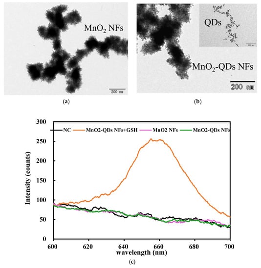 (a) The TEM image of the MnO2 NFs; (b) The TEM image of the MnO2-QD NFs. The inset is the TEM image of the QDs; (c) The fluorescent spectra of the QDs, MnO2 NFs, MnO2-QD NFs, and the mixture of the MnO2-QD NFs and GSH.