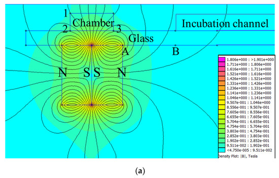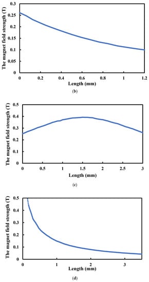 (a) The distribution of the magnetic field; (b) The strength of the magnetic field in the separation chamber at the vertical direction; (c) The strength of the magnetic field in the separation chamber at the horizontal direction; (d) The strength of the magnetic field from the separation chamber to the incubation channel.