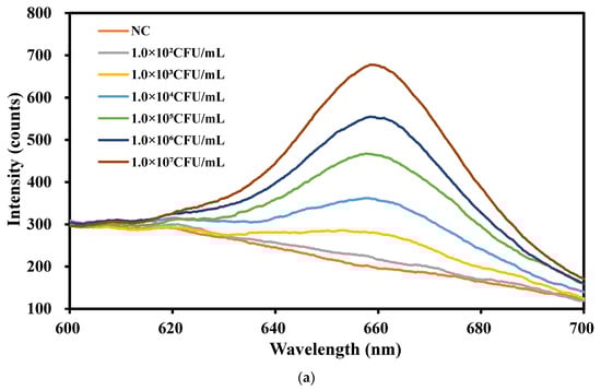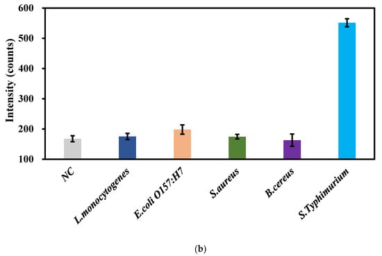 (a) Detection of chicken samples spiked with Salmonella Typhimurium (N = 3); (b) Detection of L. monocytogenes, E. coli O157:H7, S. aureus, B. cereus, and S. Typhimurium at the same concentration of 105 CFU/mL, and the negative control (N = 3).