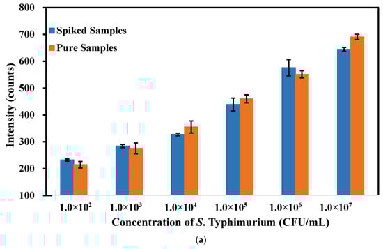 To evaluate the applicability of this biosensor for detection of Salmonella Typhimurium in food samples, chicken meats were purchased from the local supermarket and used as a real sample model. Prior to testing, 25 g of a chicken meat was added into 225 mL of PBS to obtain the supernatant. Different concentrations of target Salmonella Typhimurium cells were added into the supernatant to prepare the spiked chicken samples with the bacterial concentrations ranging from 1.0 × 102 to 1.0 × 107 CFU/mL, which were detected by this biosensor. As shown in Figure 5a, there are only slight differences on the fluorescent intensity between the spiked chicken sample and the pure culture at each concentration, which are mainly caused by non-specific binding of the impurities in the spiked samples. The recoveries (the ratio of the readout of the biosensor to the original concentration) for the concentrations from 1.0 × 102 to 1.0 × 107 CFU/mL were 111.5%, 104.0%, 90.6%, 94.7%, 105.0%, and 92.6%, respectively, and the mean recovery was 99.7%, verifying the applicability of this fluorescent biosensor for detection of Salmonella Typhimurium in real samples.