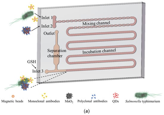 (a) The schematic of the microfluidic chip; (b) The principle of the fluorescent biosensor for rapid and sensitive detection of Salmonella Typhimurium.