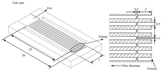 In this section, the numerical results were first compared with experimental data [30] to prove the accuracy and reliability of the model. In the previous experiment, a copper-based plate with rectangular micro-channels was fabricated, which consisted of seven parallel channels. Each of the channels was 26 mm long, 0.5 mm wide, and 0.2 mm deep. At 2 mm downstream of the entrance, the rectangle orifice with the width of 0.1mm and length of 0.2mm was designed, as shown in Figure 1. The DI water flowed through channels that were driven by the pump and cavitation was induced by a sudden drop of liquid pressure at the orifice.