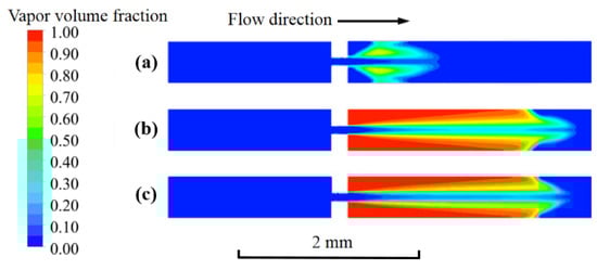 The simulated vapor-liquid distributions at the cross-section z = 0.1 mm by various turbulence models were compared with the experimental result, as displayed in Figure 4. The calculated vapor-liquid distribution by Standard k-ω model showed better agreement with the experimental result. For cavitation that occurred in a confined space, a shear flow boundary layer that formed by a large velocity gradient existed between the vapor and liquid phase. Meanwhile, the Reynolds number was relatively low downstream of the orifice. The Standard k-ω model considers the low Reynolds number effects and shear flow diffusion. Thus, it is more suitable for the wall-bound and jet flows calculation as the cavitating flow in the micro-channel.