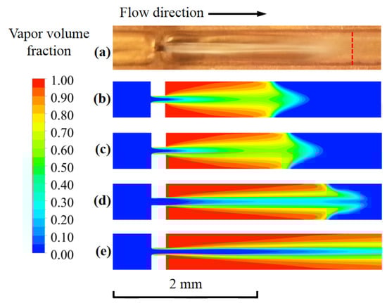 The comparison of vapor-liquid distribution between the experimental data [30] and simulation results, (a) experimental result; (b) standard k-ε model; (c) realizable k-ε model; (d) standard k-ω model; and (e) k-ω Shear-Stress Transport (SST) model.
