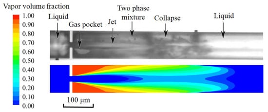 Additionally, the calculation result was compared with the experimental result that was obtained by Rooze et al. [31], as shown in Figure 5. It could be seen that a cavitating jet formed when the fluid flowed through the micro-orifice. The liquid jet was surrounded by twin vapor bubbles near the orifice. The liquid–gas two phase mixtures were observed at downstream of the liquid jet. With the recovery of pressure, those cavitation bubbles collapsed and turned into liquid. The comparison between the present results and the experimental data from literature further verified the validity of the proposed numerical method.