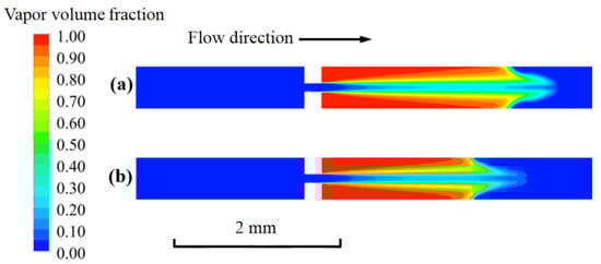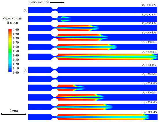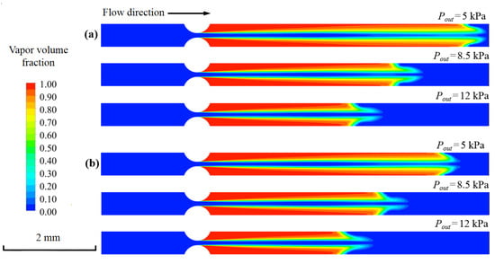 The vapor volume fraction with various outlet pressure: (a) DI water and (b) nano-fluid.