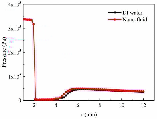In the work, the Cu nano-fluid with 3% volume fraction and particle size of 100 nm was selected. The density and viscosity of the nano-fluid were 1250 kg/m3 and 1.18 × 10−3 kg/m·s, respectively. The inlet and outlet pressure were set to be 355 and 8.5 kPa, respectively. Figure 6 shows the cavitating flow fields of the nano-fluid and DI water near the rectangle orifice. It can be observed that the cavitation jets for both nano-fluid and DI water were quite similar. However, the cavitating jet length of nano-fluid (2 mm) was a little shorter than the length of the DI water, which is in agreement with the experiment that was conducted by Medrano [32].