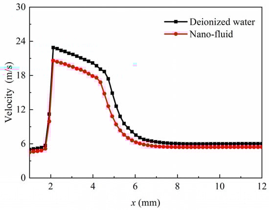 Figure 8 shows the velocities along the centerline on the symmetry plane. There was a significant increase in flow velocity at the orifice, due to the sudden decrease of the flow area and the cavitation phase change. The maximum cavitating jet velocity of the DI water reached approximately 22.9 m/s, which was a little higher than the jet velocity of the nano-fluid (20.4 m/s). It indicated that the cavitation intensity of nano-fluid could be about 12% lower. After flowing through the orifice, the velocities of both fluids began to decline. At the very beginning, the velocity decreased relatively slower in the cavitation zone, because of the presence of the vapor phase. By comparison, a more significant decline of the velocity occurred after the cavitation collapse.