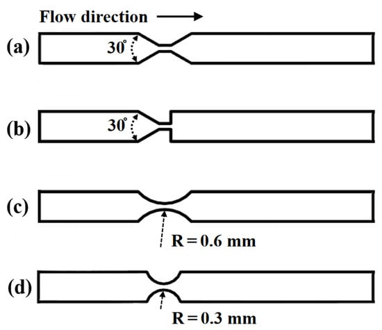 In this section, the effects of the orifice structures on cavitation characteristics were analyzed. Besides the rectangle orifice, four orifices as the converging-diverging orifice, the converging orifice, and the curved orifices (R = 0.3 and 0.6 mm) were selected, in which are shown Figure 9. The micro-channel width to the orifice minimum width ratio was Wc/Womin = 5. For the converging-diverging orifice, the contraction and divergence angles are both 30 degrees, as shown in Figure 9a. Additionally, the contraction angle of the converging orifice is 30 degrees (see Figure 9b). The micro-channels with curved orifices are shown in Figure 9c,d, and the radii are 0.6 and 0.3 mm, respectively.
