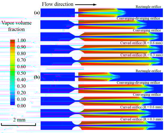 The vapor volume fraction with various orifice structures: (a) DI water and (b) nano-fluid.