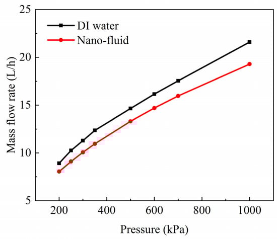Mass flow rates of the nano-fluid and DI water under different inlet pressures.