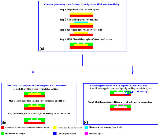 The generic schematics of layer-by-layer SU-8 micromachining. (a) Common steps; (b) Steps for out-of-plane SU-8 MEMS structures; (c) Steps for in-plane SU-8 MEMS structures.