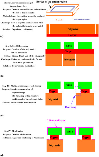 Illustration of the border-bulk micromachining process for SU-8 in-plane MEMS structures. (a) Direct micromachining of the polyimide layer; (b) SU-8 lithography on the surface of the copper layer; (c) Multi-purpose wet etching; (d) Metallization.