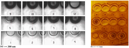In Figure 3, the number of laser cut passes associated with each test structure was inscribed on the film. Shown in Figure 3a, for a Pyrulax™ composite with a 45 µm polyimide layer, both the copper layer and the polyimide layer would be penetrated when the laser cut was repeated 12 times. When the cut was repeated 6 times, the profile of the circle became significantly blackened. As shown in Figure 3b, for cuttings repeated more than 6 times, the corresponding circular plates were disconnected from the substrate. Thus, these cuttings have penetrated the polyimide layer, reaching the copper layer, while the blackened profile in Figure 3a can be used as an indication for the penetration of the polyimide layers.