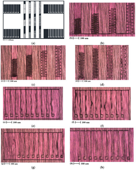 As mentioned during the discussion of the first (Figure 2a) and second step (Figure 2b), when a specific type of Pyrulax™ composite and SU-8 layer have been selected for the fabrication, one-time experimental calibrations for laser micromachining on polyimide and SU-8 lithography on copper surface are necessary, in order to determine the corresponding design rules.