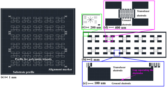 For the laser micromachining using the mask shown in Figure 5a, the relative output power was kept at 85%, and the laser speed at 1 mm/s. The laser cut was repeated 7 times to create polyimide ‘islands’ isolated from the rest of the substrate, while for the drilling of alignment markers, the laser cut was repeated 14 times.
