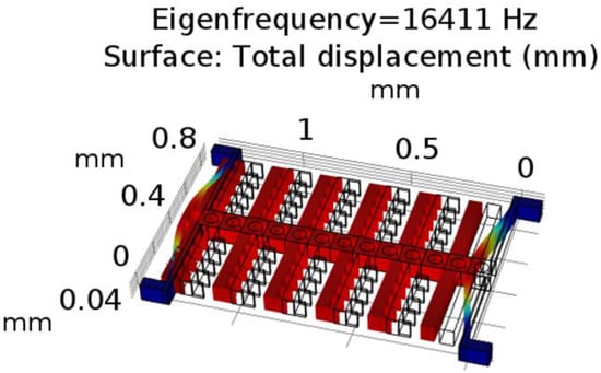 For the laser micromachining mask in Figure 5a, the white lines correspond to the designed path for the laser cut. As shown in Figure 5a, the size of the Pyrulax™ composite used as substrate was 30 mm by 33.4 mm. On the surface of the polyimide layer, 30 ‘islands’ isolated from the rest of the substrate were created by laser cutting along their borders, corresponding to 30 in-plane SU-8 MEMS structures on the copper surface. For these ‘islands’, the laser path only needs to etch the polyimide layer. At the corners of the ‘islands’, markers were designed to help the alignment during the lithography on the copper surface. For these markers, the laser pass must penetrate both the polyimide and the copper layers, to make the alignment makers visible on the copper surface. The alignment marker design in Figure 5c corresponds to the laser-micromachined markers in Figure 5a. For one of the proof-of-concept structures, Figure 5d shows the implementation of the area-varying comb drives ensuring the electro-mechanical coupling. Release holes were spaced by 100 µm from each other on the movable parts. To avoid electrical short-circuits between different electrodes, as shown in Figure 5e, a 50 µm gap was designed between the transducer electrodes and the ground electrodes. For the proof-of-concept structures, the simulation result of their mechanical fundamental resonant frequency, to be used in the evaluation of process predictability, is shown in Figure 6.