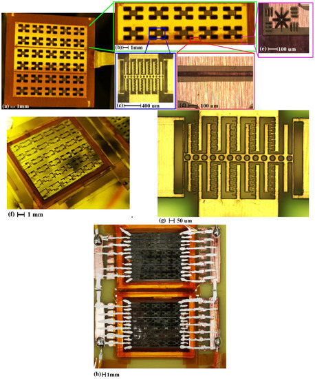 As shown in Figure 7f, the surface of the proof-of-concept structures was reflective, without any cracks, after the sputtering of aluminum, indicating a good deposition quality. This conclusion can be further supported by the zoom-in view for a single structure in Figure 7g. As shown in Figure 7h, the packaging was done using Kapton tapes to fix the structures on a PCB board. The pads and the electrodes on the samples are electrically interconnected using silver paint.