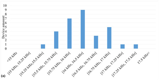 Table 3 provides the statistical information on the mechanical resonance measurements for the 30 selected test structures (15 from each batch), while the measurement result is illustrated in Figure 8. In addition, a video recording of the motion of a transducer during actuation is available as a separate supporting file.