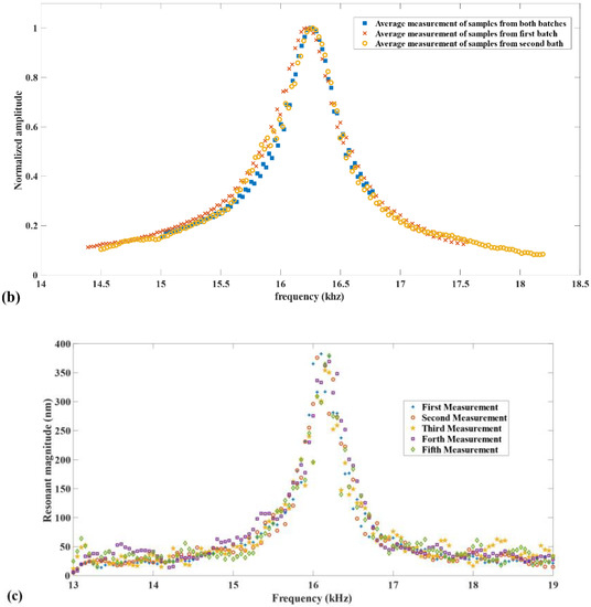 Figure 8a shows the distribution of the measured resonant frequencies among the 30 measured test electrically actuated resonators, close to a normal distribution profile. In Figure 8b, the averaged mechanical resonance responses of the 15 test structures from each batch are compared. Besides a very minor variation in the resonant frequency, the averaged measurements of the two batches also have similar profiles. These results provide extra evidence for the good batch-level reproducibility of the fabrication technology. In Figure 8c, five repeated measurements were performed on the same structure, showing the stability and consistency of the measurement results. Overall, the presented predictability, reproducibility and controllability demonstrate the general robustness of the newly designed fabrication flow.