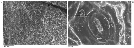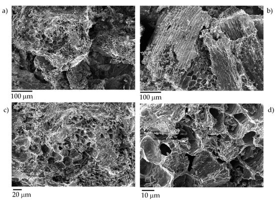Biochar produced from tea leaves showed a channeled surface with thin inter-channels walls up to 1 µm. The pore diameter ranged from 10 to 20 µm. The channel structure was detected only in pyrolyzed leaves due the expansion of the channels, as reported by Bartoli et al. [46]. In this case, the pores’ collapse was balanced by the massive release of volatile organic matter from the inner core of the materials avoiding a reduction of pore diameter.