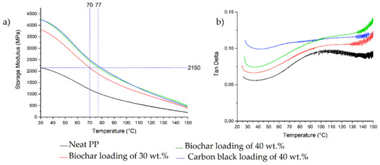 At first glance, it can be clearly observed that storage modulus of PP containing carbon black or biochar at 40 wt% are almost identical, and therefore in terms of mechanical properties there is no difference in substitution of pyrolyzed tea for carbon black. The modulus of all the samples decreased with increasing temperature, which was caused by the increase in segmental PP chain motion with temperature. After the addition of 40 wt% of both fillers, the storage modulus at 30 °C almost doubled. Interestingly, at approximately 77 °C, the storage modulus of neat PP dropped to 1080 MPa; whereas, the composites with 40 wt% of both fillers showed a storage modulus of approximately 2150 MPa, close to that of pure PP at 30 °C. The loss factor reported, and shown in Figure 3b, showed the increment of dissipated energy to the energy stored per cycle of sample deformation with the increased of filler loading.