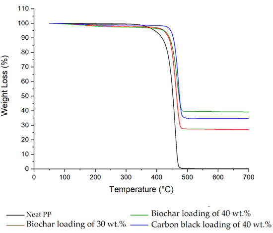 Thermal stability of different composites: neat polypropylene (PP), biochar (30 and 40 wt%), and carbon black (40 wt%).