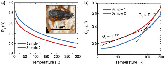 Firstly, two samples of the as-produced biochar were analyzed to determine the temperature dependence of their electrical sheet resistance, Rs. Results are shown in Figure 5a.