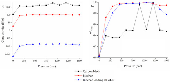 First, we evaluated the conductivity of the fillers. The used methodology tightly compacted the powders and a trustworthy value was obtained. We evaluated the conductivity of the powders showing the better performance of carbon black upon biochar. Carbon black powder reached a conductivity of up to 1700 S/m, whereas, in the same conditions, biochar reached a conductivity of 105 S/m. This trend was not observed in the case of the composites. Composites filled with 40 wt% carbon black or with a biochar loading of up to 30 wt% were not conductive, whereas those produced using biochar loading showed a low conductivity of up to 5 × 10−4 S/m. The rapid conductivity increment between 1 and 500 bar is highlighted in Figure 6b, where the conductivity values were normalized. The conductivity of biochar and related composites increased faster than that of carbon black. Carbon black showed an interesting behavior at high pressure, with some fluctuation reasonably due to the packing process of nanometric carbon particles. The axial deformation reached 44% of the initial thickness of the 40 wt% biochar loaded samples under a pressure of 1500 bar, while the non-axial deformation was not appreciable. After the pressure was removed, the deformation did not disappear, and the thickness of the samples remained fixed at its high-pressure value.