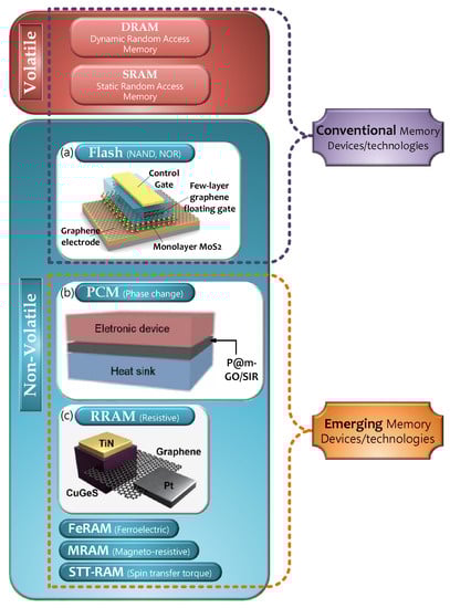 Diagram of conventional and emerging memory devices/technologies, including (a) a schematic illustration of flash memory device fabricated with graphene/MoS2 materials [], (b) a schematic representation showing memory device with phase change materials P@m-GO/SIR [], and (c) a schematic of graphene-based resistive random access memory (RRAM) device [].