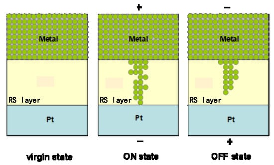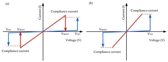 RRAM devices fabricated with a typical MIM (metal–insulator–metal) sandwich structure are electrically characterized with two different resistance states, which are generally referred to as the high-resistance state (HRS) and low-resistance state (LRS). The high-resistance value of the device shows the low-conductance state, while the device demonstrates the high-conductance state with the low-resistance value. The on/off ratio is determined by the ratio between HRS and LRS. With the applied voltage bias, the set operation is defined from HRS to LRS, and the reset operation is the transition from LRS to HRS. Stop voltages of the set and reset process are defined as VSET and VRESET. In general, two different switching types are defined as unipolar and bipolar [,,,,,], as illustrated in Figure 2. The unipolar switching mode is defined by the amplitude of the applied voltage bias, while the bipolar switching depends on the polarity of the applied voltage bias. In addition, as an NVM device, the endurance and retention properties of RRAM are also the basis of device reliability.