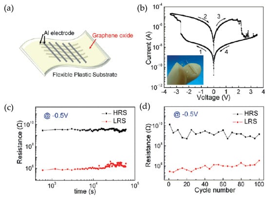 Wang et al. reported a GO-RRAM device with the structure of Al/GO/ITO/PET, as illustrated in Figure 11a. The GO thin film was spin-coated onto the ITO substrate. According to their perspective, the speed of rotation process and the GO precursor solution concentration determined the growth rate and thickness of the GO thin film. They controlled the growth rate at around 0.4 nm per GO drop, and the rotation speed was 1000 rpm. The fabricated device could operate with an operation voltage lower than ~2.5 V and the on/off ratio was about ~280. The retention was higher than 104 s, and the endurance cycles were more than 110. In addition, with the pulse behavior measurement, they also found that the resistance state switching from LRS to HRS could appear with a 100-ns pulse width, while the switching process from HRS to LRS could only be achieved with a 100-μs pulse width [].