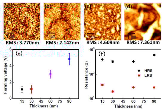 Apart from the choice of TE and BE, other features like surface roughness and obtained thickness of the GO dielectric layer cannot be neglected, as illustrated in Figure 5 [,]. Figure 5a–d demonstrate the surface roughness of a GO thin film deposited on different BEs, observed using an atomic force microscope (AFM). The low surface roughness of GO thin films can be obtained with its deposition on a smooth BE, such as inert metals like Pt (RMS 2.142 nm) and compounds like ITO (RMS 3.770 nm). Higher roughness is observed for GO thin films with BEs like TaN and Au due to the existence of cracks. Because of the presence of these cracks and a rough surface in GO dielectric layers, penetration might occur more easily in electrode materials, leading to failure of effective RS performance. Device discrepancy likely results from contrasting thermal properties between GO and electrode materials. As illustrated in Figure 5e, the forming voltages of Cu/GO/Pt RRAM devices are obviously influenced by the thickness of GO films. During the forming process, the required voltages synchronously increase with the thickness of GO thin films, which indicates that the internal electrical field in the GO dielectric layer plays a decisive role in the forming operation. After the forming operation, Figure 5f demonstrates the resistance states (HRS and LRS) of Cu/GO/Pt RRAM devices. The relationship between resistance values and thickness of GO thin films can be considered as a function, as reported by Zhuge et al. [].