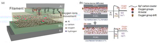 One year later, Panin et al. also reported a device with an Al/GO/Al structure, which presented the importance of local resistance state induced by the contact of Al and GO layers []. With the positive voltage bias applied onto the Al layer in the forming process, a highly resistive region formed near the TE. Under the effect of an external electrical field, oxygen ions stored in the dielectric layer drift to the electrode, which can result in the continuous formation of an sp3 hybridization layer between Al and the structure-modified GO layers at the HRS. When a negative voltage bias is applied onto the TE Al layer, the reverse diffusion of oxygen ions leads to LRS CFs near the contact interface under the effect of a negative electrical field [].