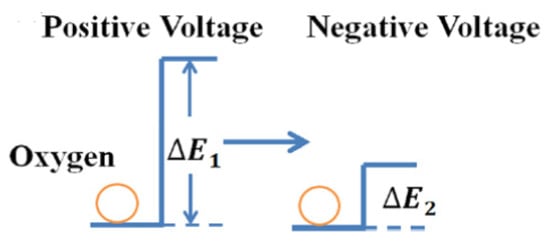 According to a report from Wang et al. [], the diffusion of oxygen ions can be used to explain the switching performance, as well as the operation speed, of graphene-based RRAM devices. The oxygen ion migration of a device is affected by the existence of a barrier on hopping energy. The inhomogeneity of electron density in a dielectric layer is a decisive influence factor in the electron extraction and injection process, which significantly affects the performance of the hopping energy barrier. During the set operation, the hopping energy barrier is reduced due to the electron extraction of the dielectric layer, which increases the oxygen ion mobility, as illustrated in Figure 7. Conversely, the electron injection process from the metal electrode into the dielectric layer during the reset operation increases the energy barrier and decreases the diffusivity of oxygen ions. Therefore, compared with its long set speed (~80 us), the RRAM device in Reference [] showed a shorter speed (~90 ns) in the reset operation.