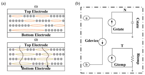 (a) Illustration of transport mechanism in GO-RRAM based on hybridization state modulation; (b) SPICE macro implementation of the compact hybridization state modulation model.