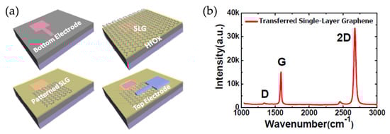 (a) Fabrication process of HfOx-based RRAM device with single-layer graphene (SLG) interlayer and (b) Raman spectroscopy data of transferred SLG layer [].