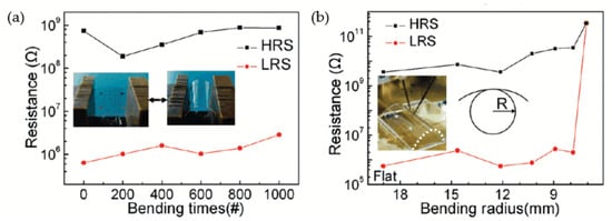 As illustrated in Figure 12, Jeong et al. reported an RRAM device with an Al/GO/Al/PES structure, which was fabricated with a spin-casted GO thin film. The fabricated device could complete the switching process with an operation voltage lower than 2 V and an on/off ratio higher than 103. Figure 12b demonstrates the measurement effect of device performance induced by bending times and radius, which indicates that the Al/GO/Al/PES structure is suitable for flexible NVM devices. According to their perspective, the spin-casting process with enough simplicity and scalability can be a choice for the fabrication of large-area uniform GO thin films, whereas the final goal is to allow the fabricated GO thin film to be transferred to all kinds of flexible substrates. Furthermore, the spin-coating technology applied to practical devices might have great potential for integration with current standard COMS processes, in order to provide a contribution during the development of NVM devices [].