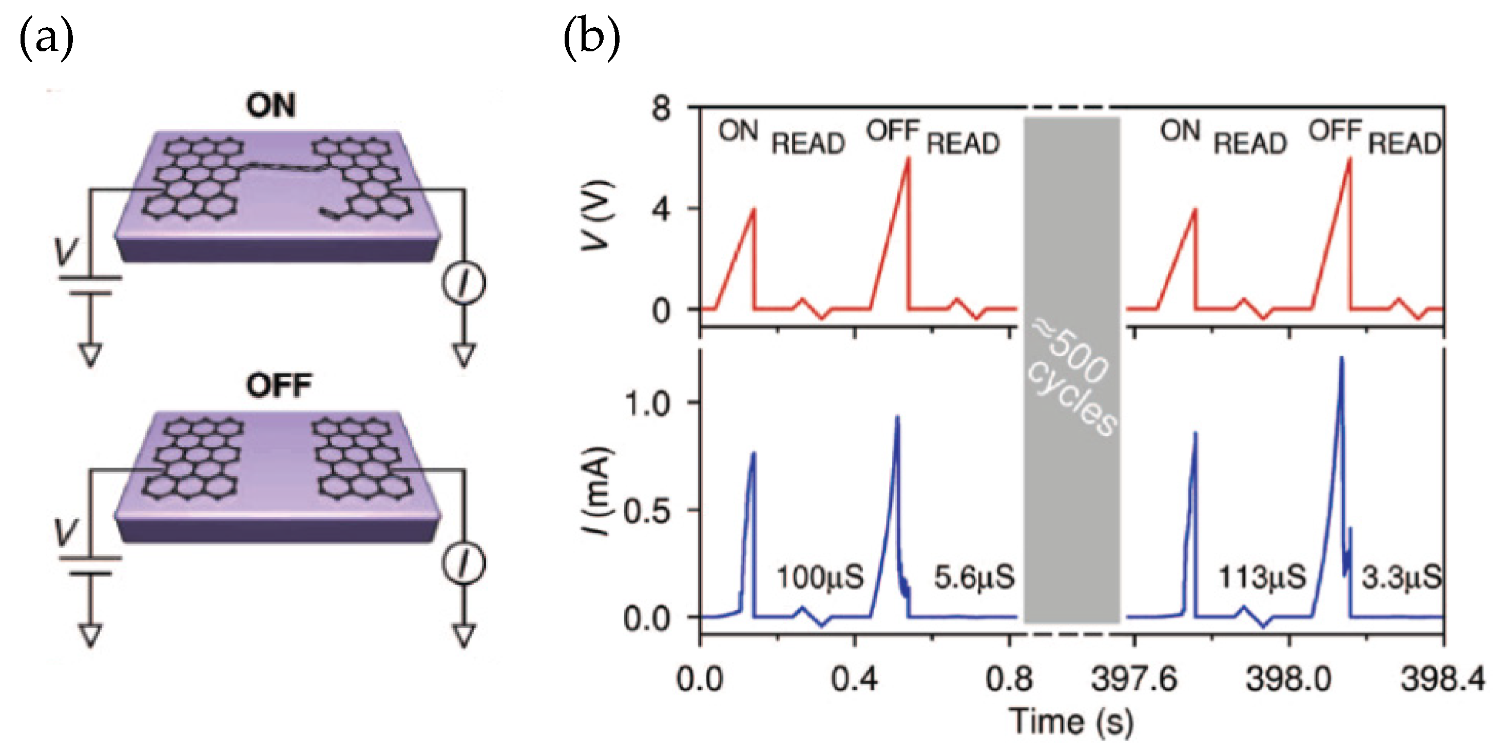 (a) Proposed schematic atomic configurations in the on and off states of transistor-type memory. (b) Repeatable programming over hundreds of cycles [].