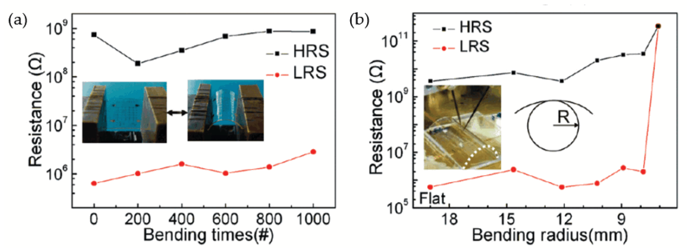 Measurement of bending effect for Al/GO/Al/PES RRAM devices. (a) The relationship between on/off ratio and bending times and (b) the relationship between on/off ratio and bending radius [].
